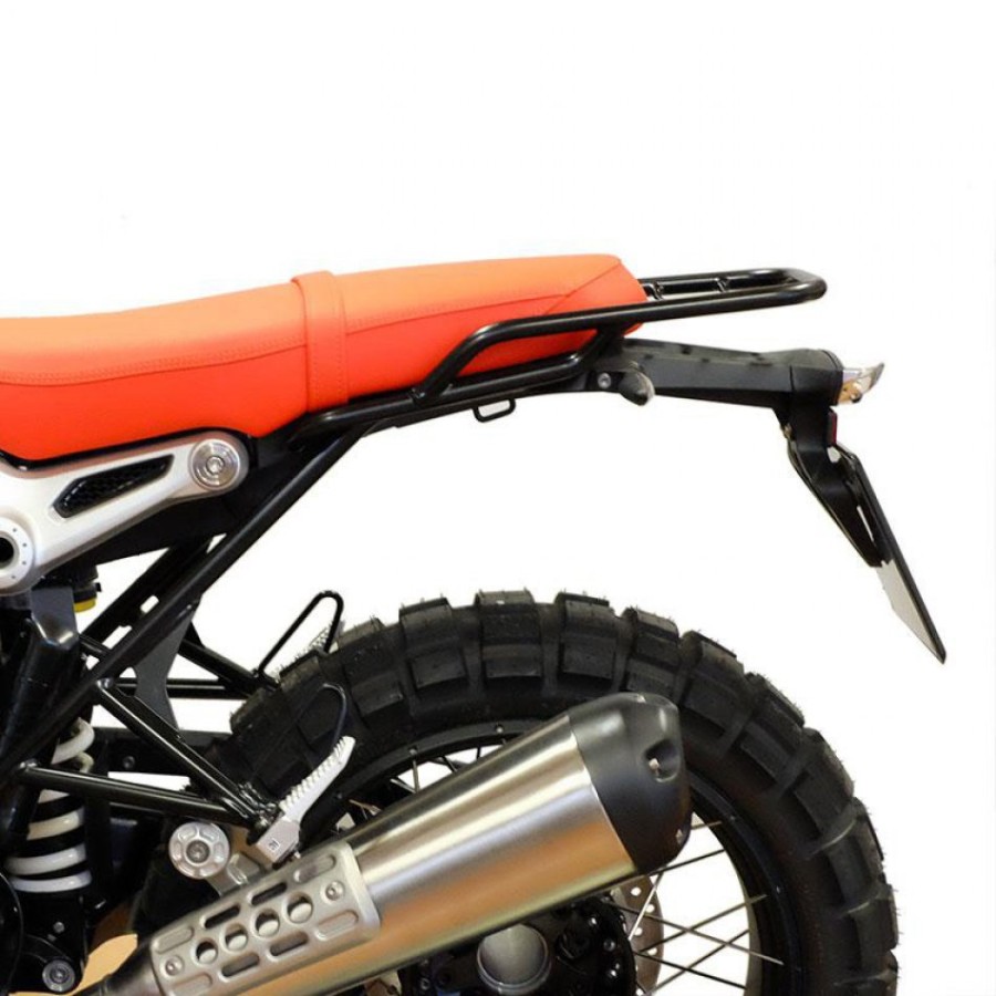 Porte-bagages en tubes d'acier avec finition époxy noire mat. Il s'intègre harmonieusement à l'arrière de la moto et est équipé de poignées passager. Son installation sur le cadre est simple et rapide, une fois la selle retirée. Robuste et pratique, il sublime l'esthétique de la moto.