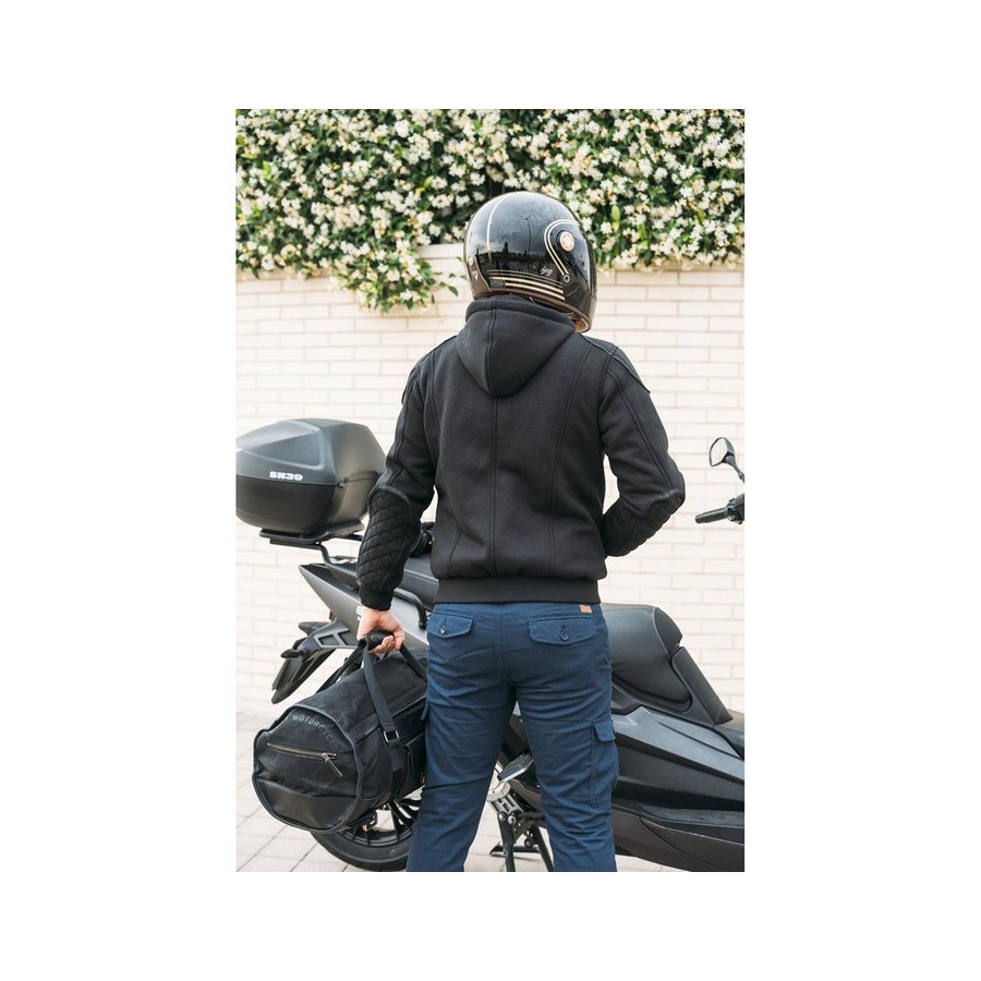 La veste By City Street est fabriquée en coton résistant à l'abrasion. Elle possède 3 poches extérieures et 2 poches intérieures avec éléments réfléchissants. Fermeture éclair centrale à double curseur YKK. Poche intérieure thermique pour protection dorsale (non fournie). Doublure intérieure amovible à manches longues (non amovible). Protections « Flexishock » détachables aux coudes et aux épaules, certifiées EN1621-1:2012 CE niveau 1. La veste est homologuée moto EN17092-7:2018 CU niveau A.