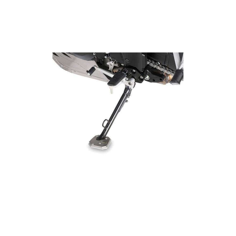 Supporto specifico in alluminio e acciaio inox, per allargare la superficie di appoggio del cavalletto laterale originale.