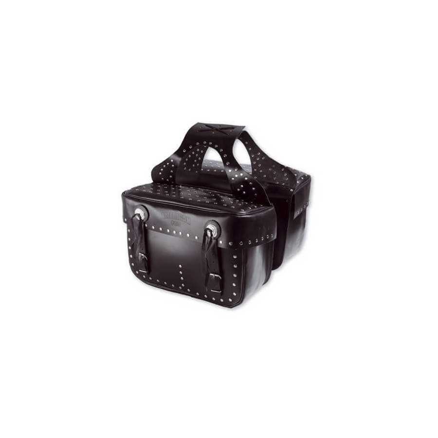 Coppia borse custom in pelle rigida sagomata.Misure 45 X 30 X 20 cm - 27 LITRI. Doppia fibia sulla parte esterna per garantire una migliore chiusura ed una maggiore sicurezza nel custodire il contenuto. Designer arricchito una tempestata di borchie cromate e da due piastrine in metallo fissate con un lacciolo di pelle. E' la borsa più ricca di borchie in'assoluto per chi vuol valorizzare la propria moto in una versione molto accantivante. Fissaggio sotto sella,composto da dei laccioli in cuoio per una migliore regolazione dell'altezza. E altri laccioli di cuoio li si trova sulla parte bassa per consentire un fissaggio alla staffa. Dotata di copriborsa per la pioggia,posto all'interno e nella parte alta,in modo da facilitarne l'uso in caso di bisogno.Bella. Un giusto compromesso per le vostre necessità.