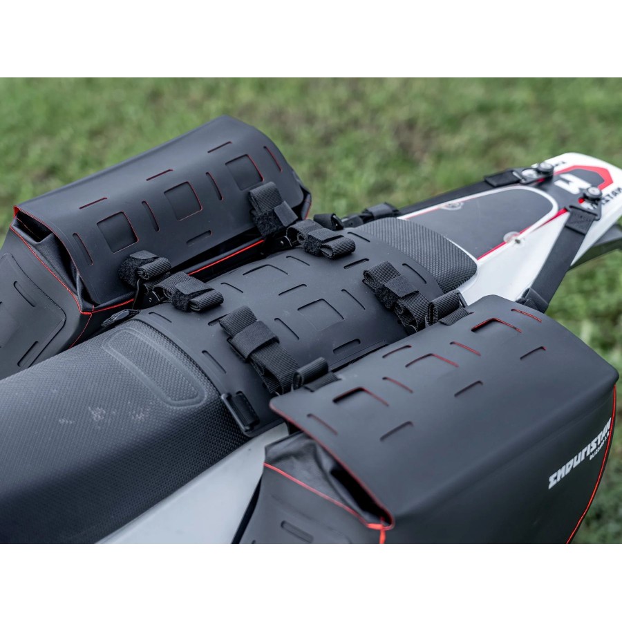Puoi aumentare il volume del carico grazie ai sette Attachment Pads brevettati – tre su ogni borsa e uno sulla sella. L’interfaccia sulla sella è così sottile che non disturba durante la guida, nemmeno nei tratti più tecnici in fuoristrada. È inoltre possibile viaggiare con un passeggero, a patto che non siano montate borse aggiuntive sulla sella.