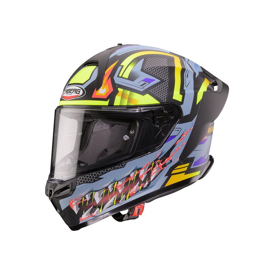 La visiera esterna è antigraffio e dotata di sgancio rapido senza utilizzo di attrezzi ed è predisposta per la lente anti appannamento Pinlock 30. Inoltre è presente un dente di aggancio per poter bloccare la visiera in posizione di chiusura evitando aperture accidentali.