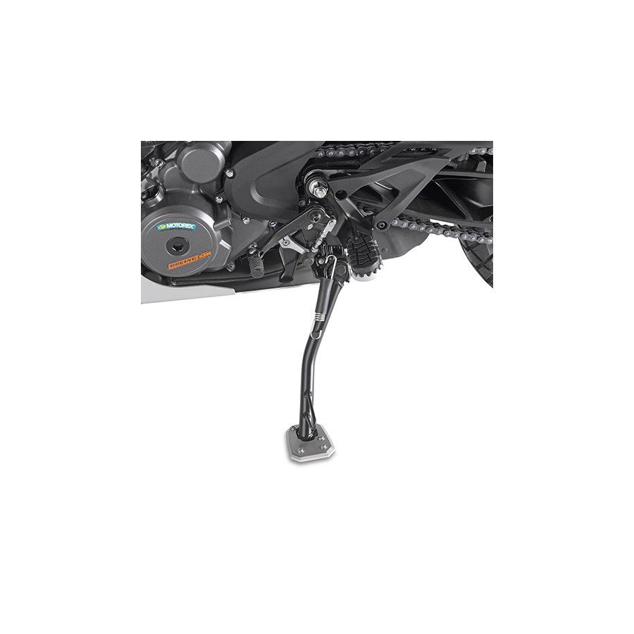 Supporto specifico in alluminio e acciaio inox, per allargare la superficie di appoggio del cavalletto laterale originale.