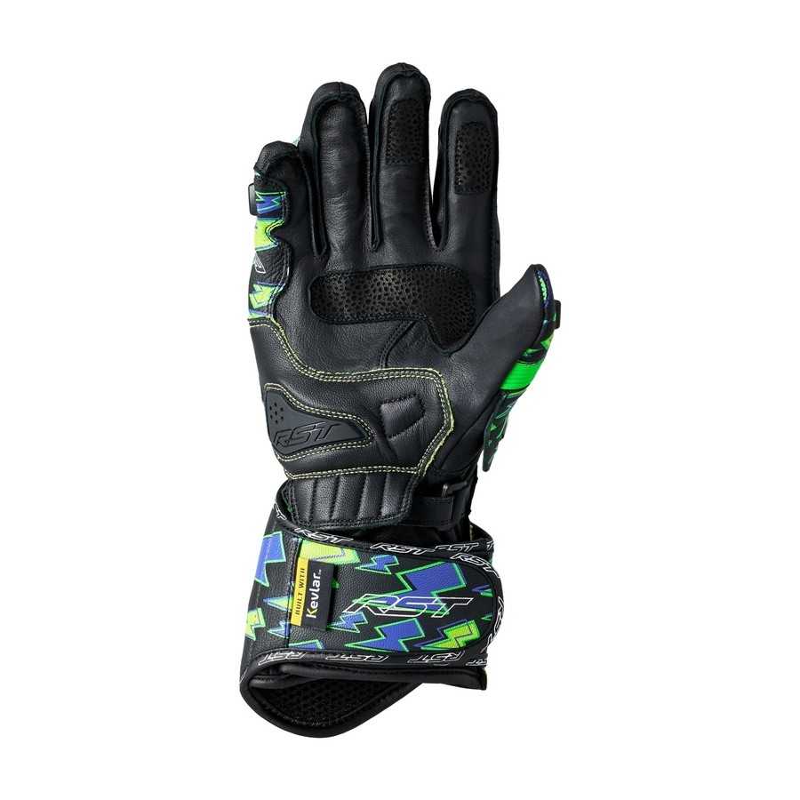 Realizzato con pelle bovina pieno fiore e pelle di canguro, il guanto è dotato di una protezione nocche in carbonio CE livello 1 per la protezione dagli urti. La fibra DuPont™ Kevlar® sulle cuciture e sulla parte inferiore del palmo, insieme alla pelle di canguro a doppio strato e un cursore del palmo RST proteggono il palmo in caso di scivolata ad alta velocità, mentre il doppio polso e la chiusura del polsino offrono una vestibilità sicura. La fodera in DuPont™ Kevlar® su tutto il resto del guanto previene lo strappo e le dita congiunte elastiche impediscono il "rollio delle dita" senza compromettere la portata o la flessibilità quando si cambia marcia.
