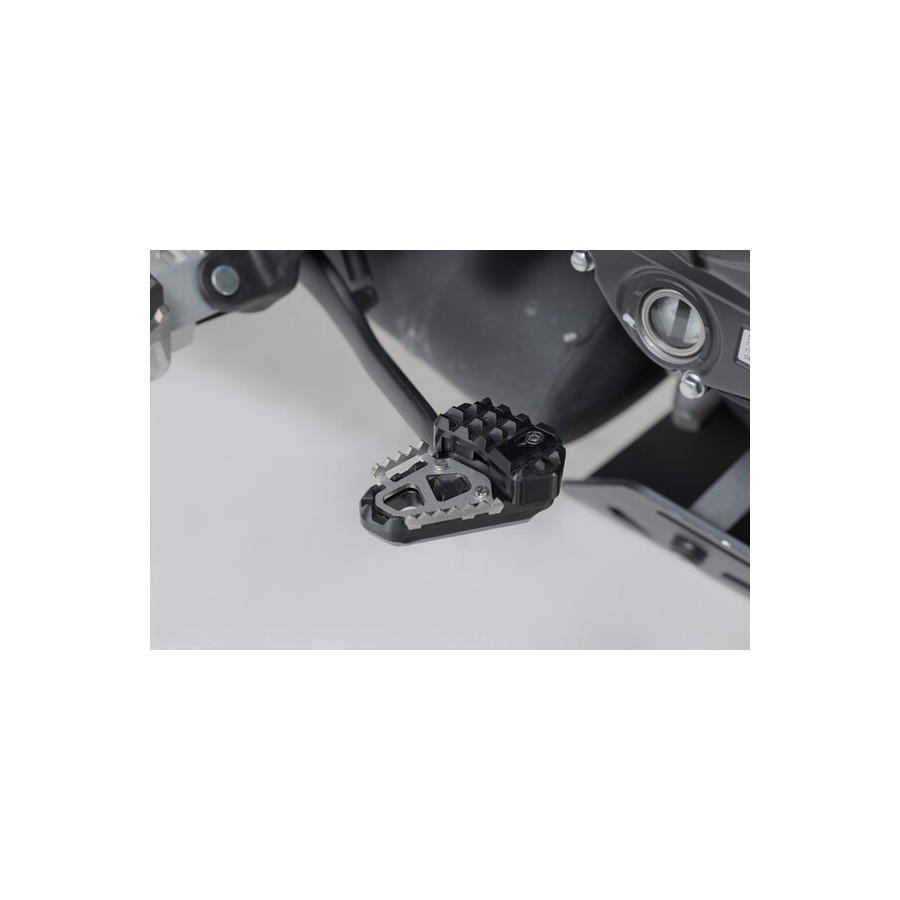 SW-MOTECH realizza le estensioni in lega di alluminio fresata e ad alta resistenza con superficie anodizzata nera e piastra base in acciaio inossidabile. Per un adattamento ergonomico ottimale, è possibile regolare la base del pedale freno su due livelli, 22 o 27 millimetri.