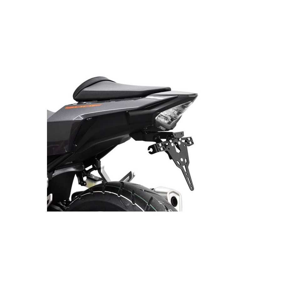 Portatarga verniciato a polvere nera che consente l'installazione senza apportare modifiche alle parti della carenatura. Inclusa luce targa a LED (omologata ECE)