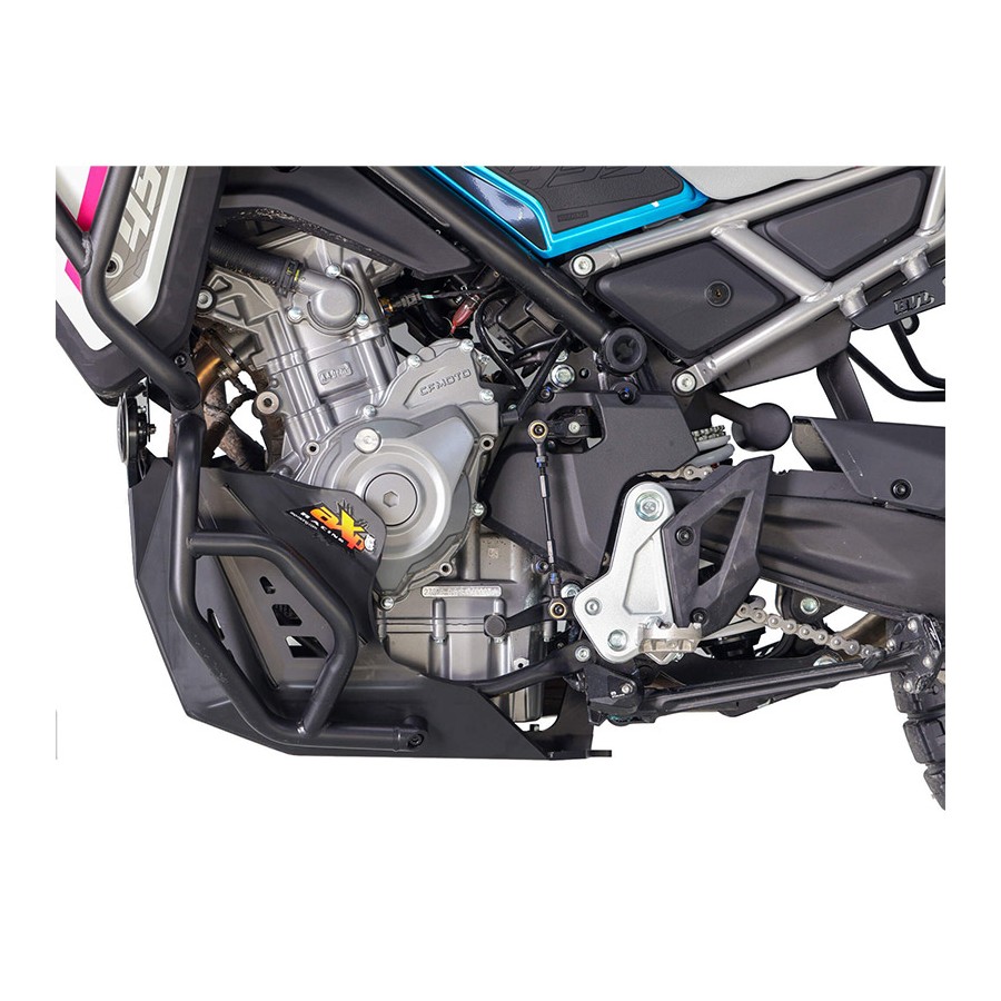 Piastra paramotore Adventure per CFMOTO 450 MT / IBEX 450 - Peso: 2,2 kg - Realizzata in polietilene ad alta densità da 8 mm di spessore, la piastra paramotore AXP offre una protezione completa alla tua moto, dalla pompa dell'acqua e dal blocco motore fino all'impianto di scarico e al carter. Sono fornite schiume ad alta densità da incollare all'interno di ciascun lato della piastra paramotore per evitare attriti con la pompa dell'acqua e il carter. Progettata per adattarsi alla tua moto CON o SENZA le barre di protezione originali, grazie agli elementi di fissaggio posizionati direttamente nel telaio. LA PROTEZIONE DEL TIRANTRO È VENDUTA SEPARATAMENTE CON IL CODICE DI RIFERIMENTO AX1774. Il DESIGN è BREVETTATO ed è stato sviluppato e testato con i nostri clienti! Prima di ordinare, visita la scheda delle caratteristiche e assicurati che la tua attrezzatura (barre di protezione e/o cavalletto centrale) sia compatibile con la nostra piastra paramotore. Tutte le viti e i bulloni sono inclusi nella confezione. ATTENZIONE: questa protezione motore può essere montata solo sul modello 450 MT / IBEX 450, ma non è necessariamente compatibile con tutti gli anni del modello