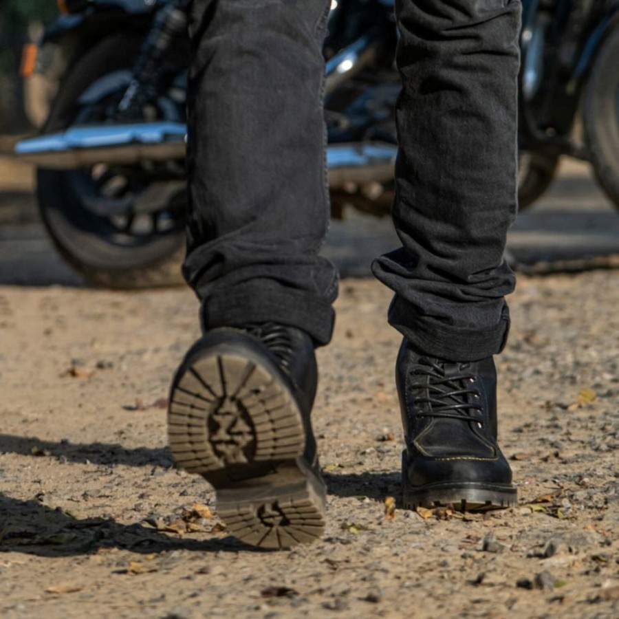Gli stivali Trip Machine Moc-toe sono un classico che ha superato la prova del tempo. Originariamente progettati all'inizio del 1900 per gli operai delle fabbriche, questi stivali sono realizzati con una caratteristica punta in stile mocassino, che offre maggiore protezione e resistenza alla zona delle dita. Il Moc-toe presenta un rinforzo aggiuntivo di 1,8 mm sulla punta e sul tallone, oltre a protezioni per la caviglia. Realizzati in robusta pelle antiabrasione, questi stivali sono progettati per proteggere in caso di scivolate accidentali. La suola è in resina, studiata per garantire un'aderenza ottimale su strada. Il rinforzo in metallo, la soletta in Texon e la fodera in Lycra di alta qualità assicurano il massimo comfort anche nelle giornate più lunghe. Gli stivali Moc-toe sono perfetti sia per la moto che per il tempo libero. Sono la calzatura ideale anche quando non si è in sella. Un classico senza tempo che unisce stile e funzionalità.