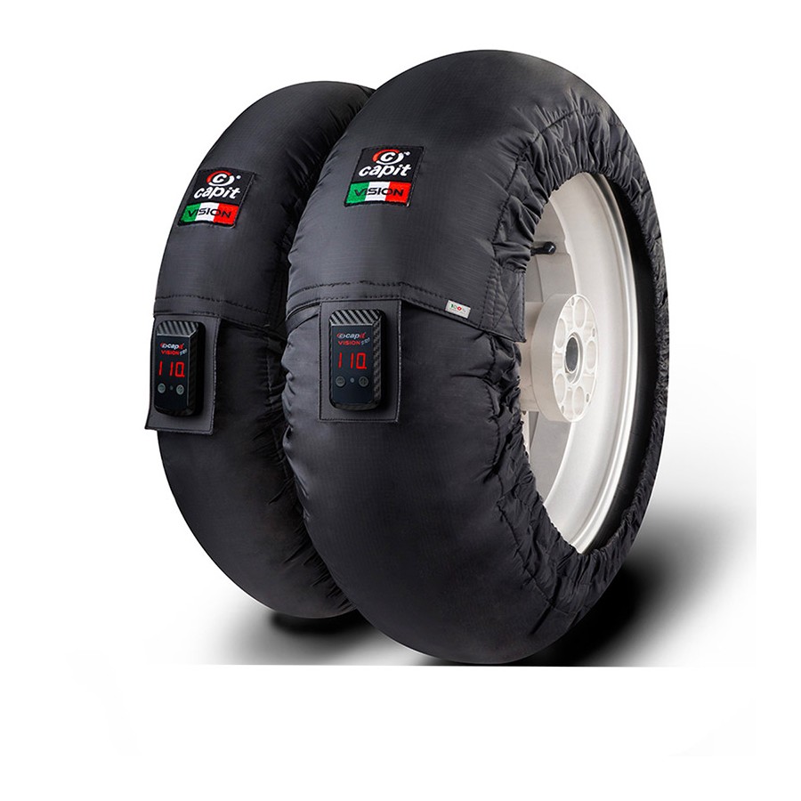 Le termocoperte moto Capit versione SUPREMA VISION sono l’eccellenza del prodotto termocoperte. Dotate di bande laterali utili ad irradiare di calore il cerchio sono un modello unico grazie alle 36 pinces (18 per lato) fatte per ottenere lo “spherical shape” ovvero una forma utile a copiare il profilo della gomma e garantire la perfetta aderenza della termocoperta al pneumatico mantenendo più a lungo il calore. Suprema Vision è dotata di una centralina di controllo integrata nella stessa termocoperta di dimensioni  ultracompatte (solo 8mm di spessore) realizzata in materiale resistente agli urti. Con soli 2 tasti è possibile visualizzare la temperatura di impostazione iniziale scelta (T set) e quella reale presente sui pneumatici (T run), visualizzare il tempo parziale (last time) e il tempo totale (total time) di funzionamento del prodotto e scegliere la visualizzazione in °C o °F.